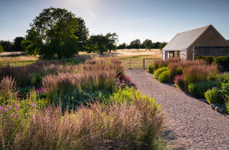 The gardens were landscaped and newly planted during spring 2020. The plant beds are laid out in a grid format with gravel paths and include some reflecting water tanks. The planting is a mix of structural grasses and herbaceous plants which blend into the meadow. They attract a lot of bees and butterflies and provide structural seed heads during winter.