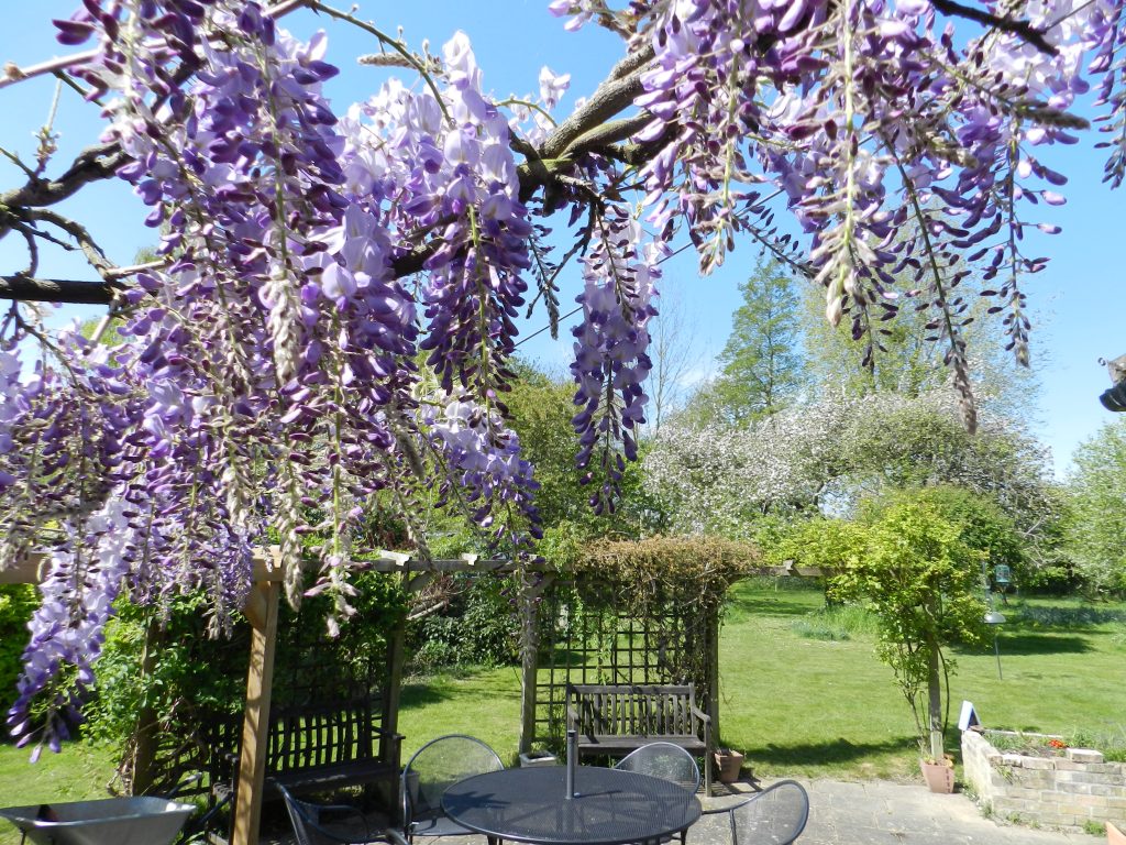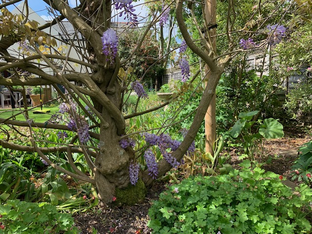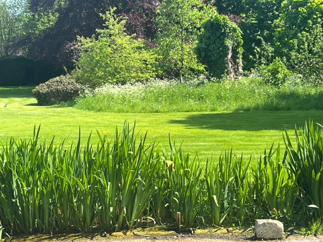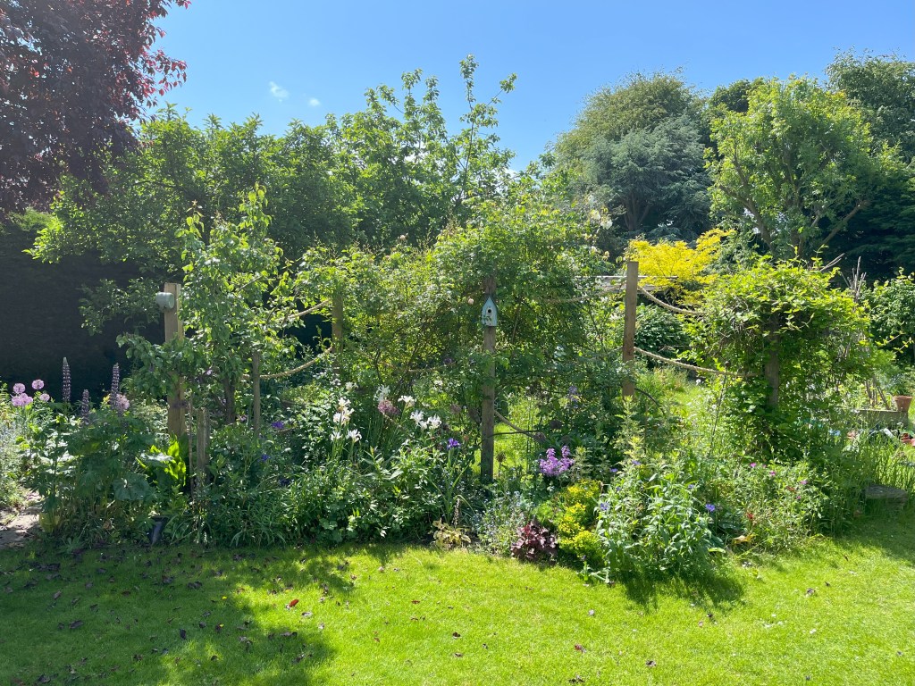 A mature garden behind a new house which has mixed cottage garden borders, a pond, raised beds and a greenhouse. This year the garden is planted for insects and wildlife, especially bees and birds, dedicated to peace and quiet.