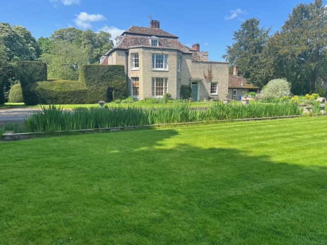 Mature garden surrounding the house with river vistas and old yew hedges dividing the garden into rooms. A rill with water loving plants runs along the front of the house.